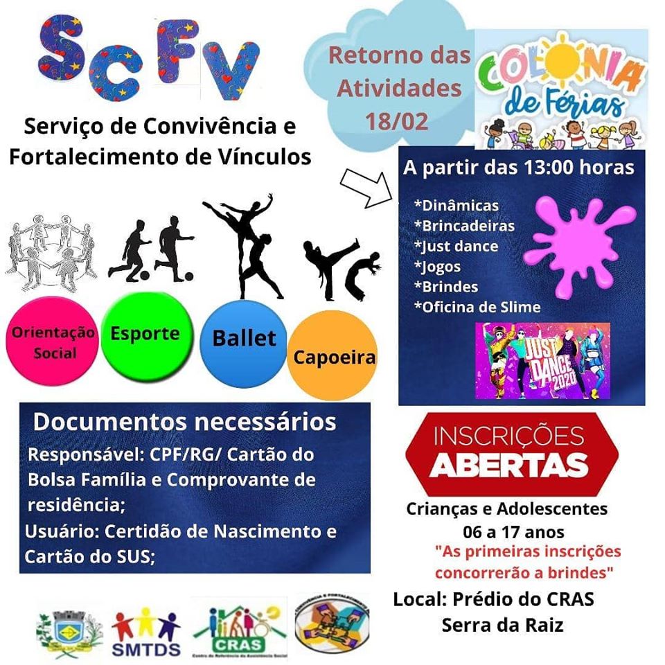 Estão abertas as inscrições para o Serviço de Convivência e Fortalecimento de Vínculos do município, as inscrições estão realizadas no prédio do CRAS no período da manhã e da tarde até o dia 17.