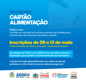 O município de Serra da Raiz foi contemplado pelo Programa Cartão Alimentação do Governo Estadual, serão beneficiadas 100 famílias em situação de extrema pobreza, sendo priorizadas aquelas que não possuem benefícios sociais.