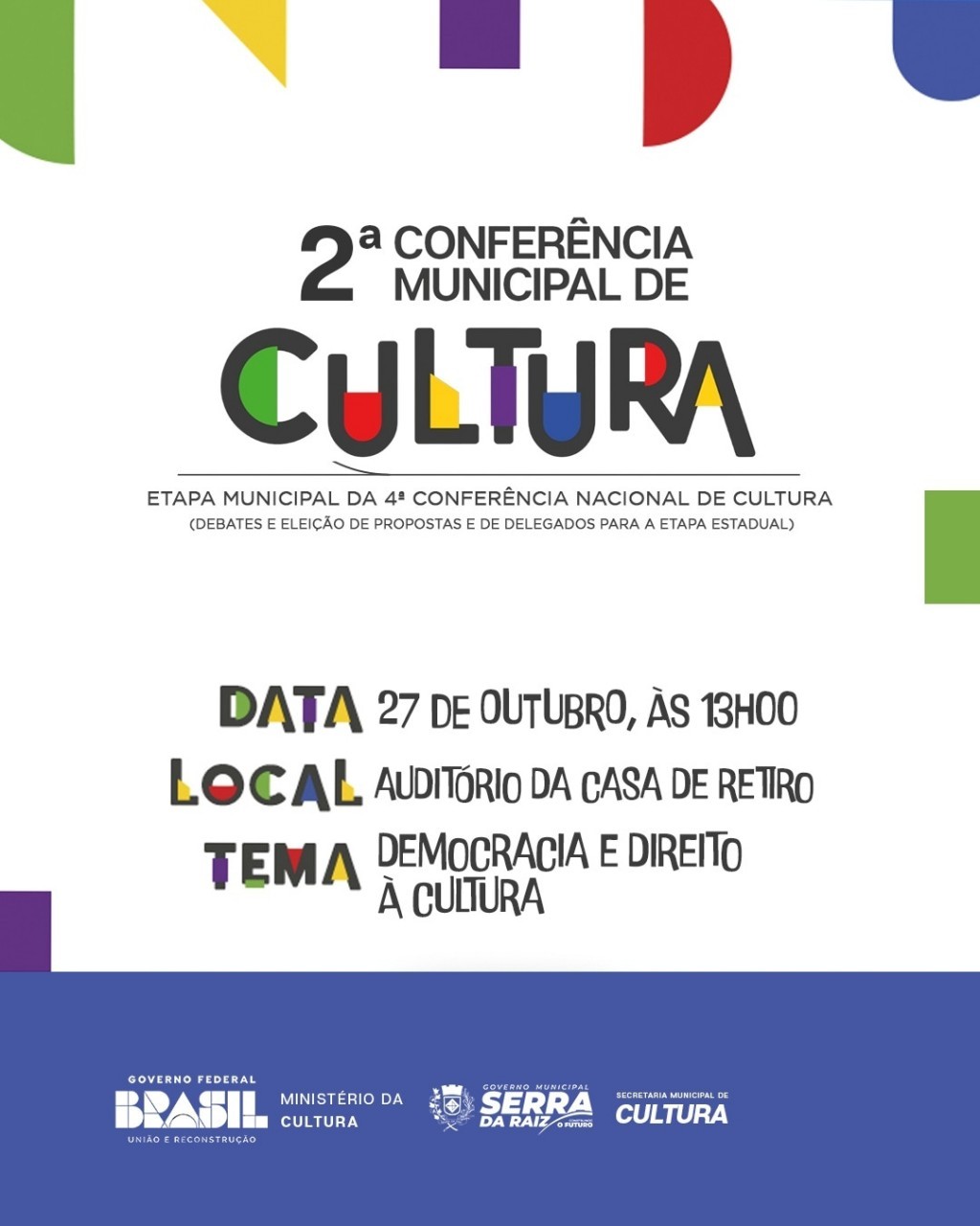 A 2ª Conferência da Cultura do nosso município acontece no dia 27 de outubro, a partir das 13h00, no Auditório da Casa de Retiro "Pe. Luis Deodato" e deve contar com a presença de autoridades e agentes culturais.
