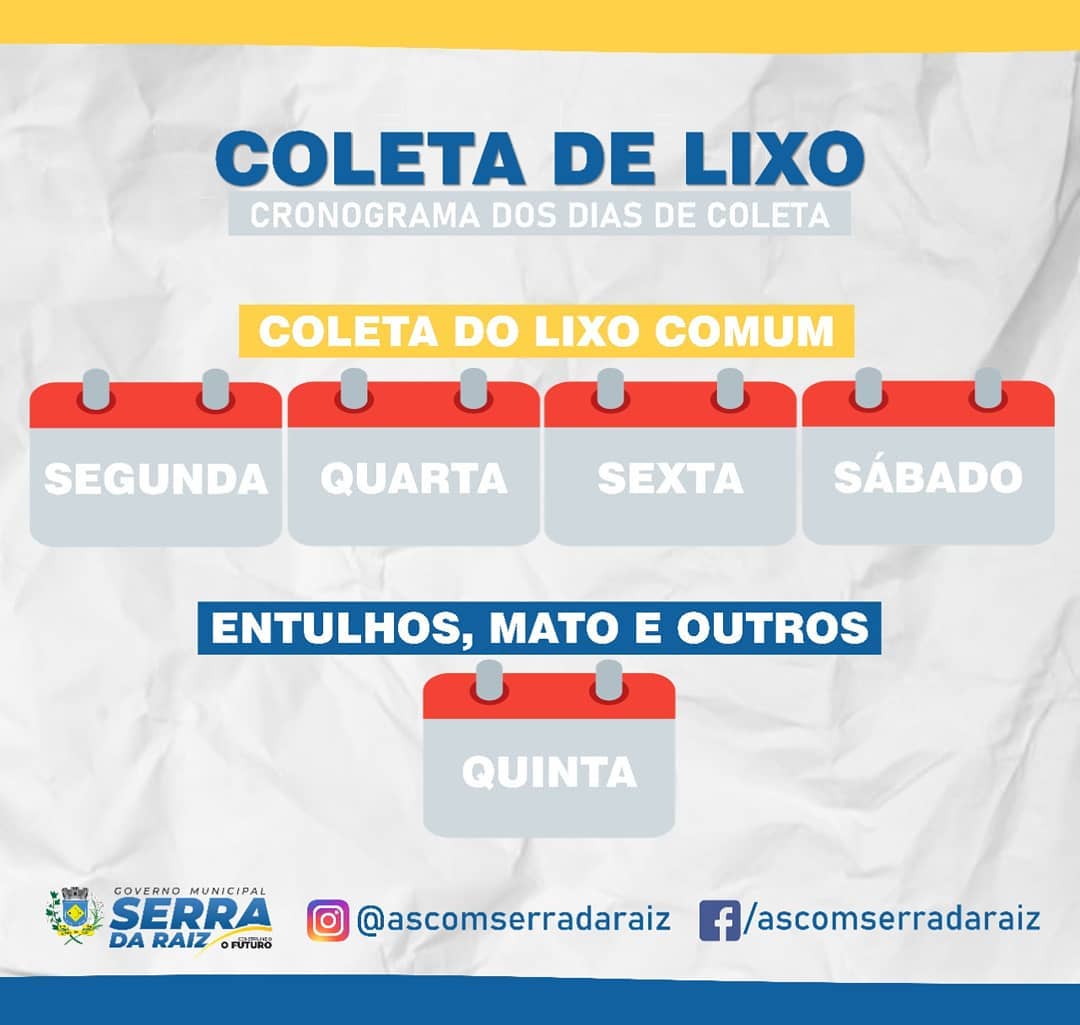 O lixo comum será retirado nas segundas, quartas, sextas-feiras e sábado e a parte de entulhos e outros como galhos etc, só na quinta-feira. Colabore colocando o lixo apenas nos dias de coletas.