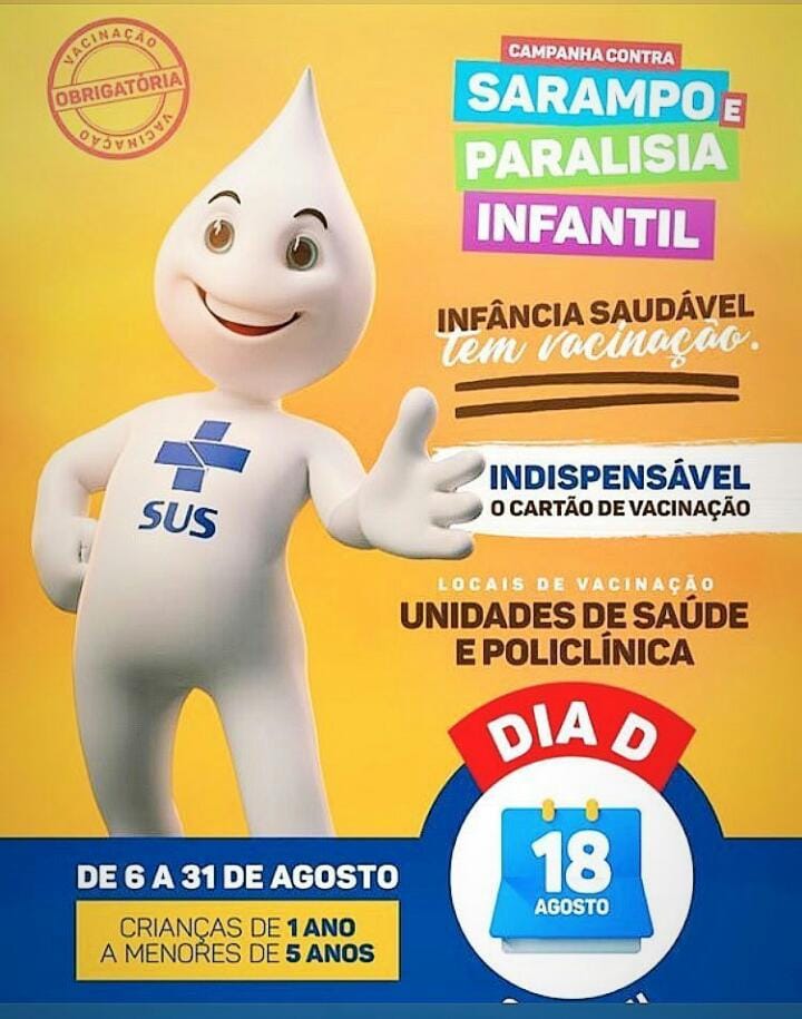 A Campanha vai até 31 de agosto, mas é importante que pais e responsáveis levem suas crianças para serem vacinadas, assim cuidando da saúde dos nossos pequenos (as), uma prova de amor e responsabilidade