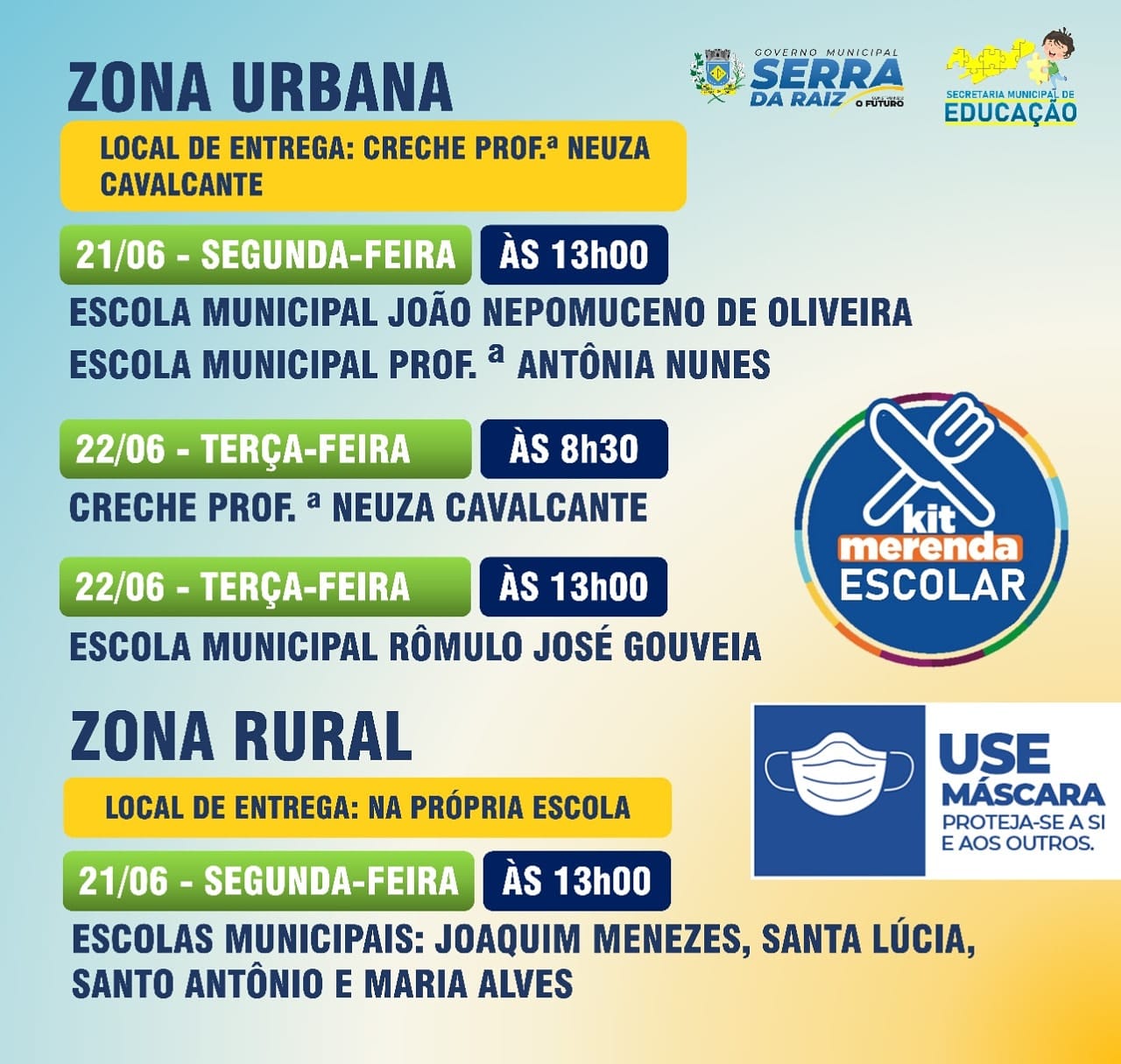 Na segunda e terça a entrega acontece na creche Neuza Cavalcante para todos os alunos da área urbana, seguindo o horário especificado no banner.