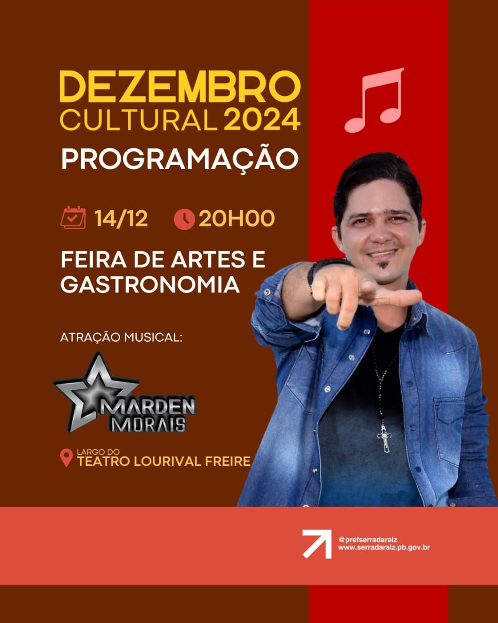 Às 20h, teremos Feira de Artes e Gastronomia, com a apresentação musical do artista Marden Morais.