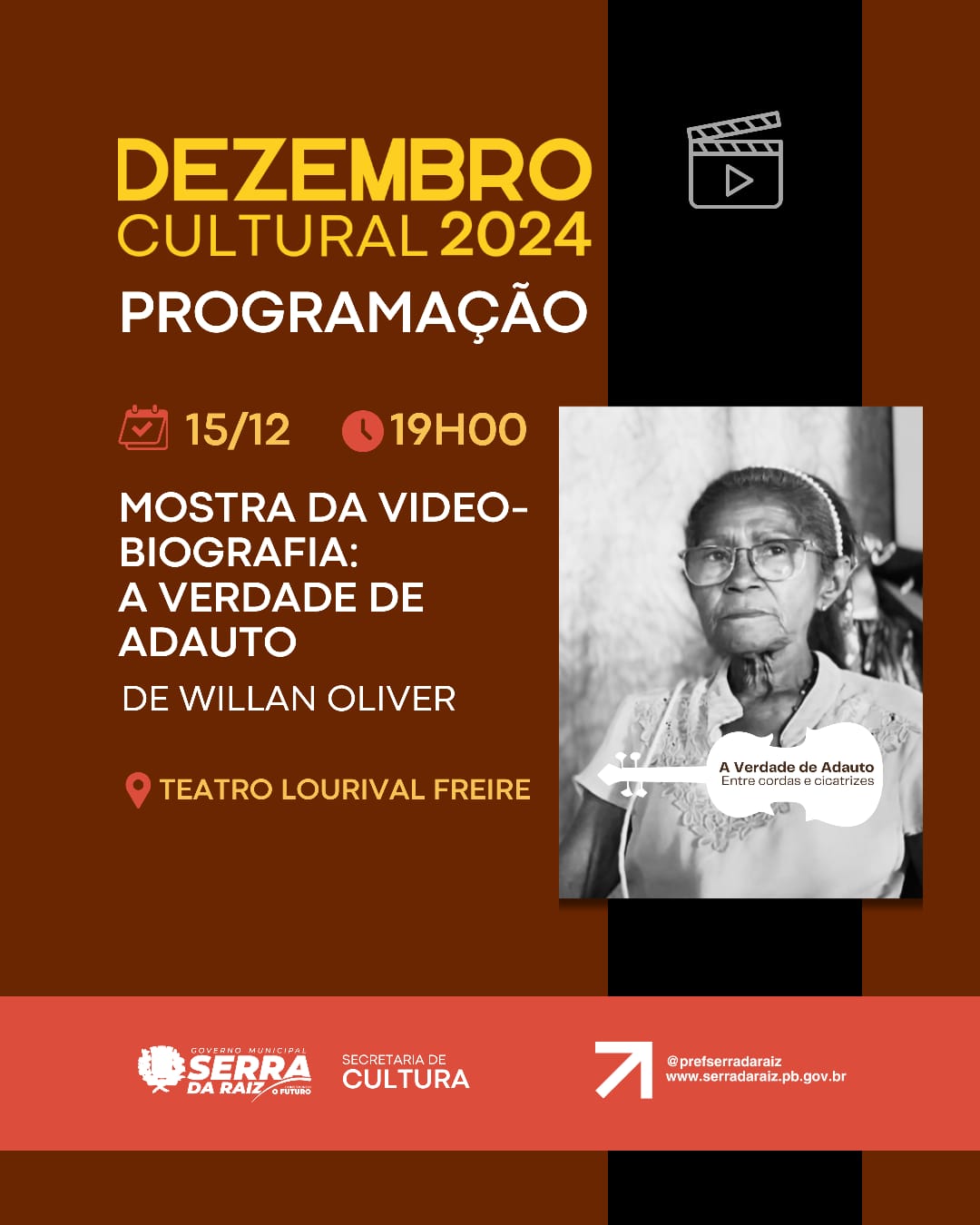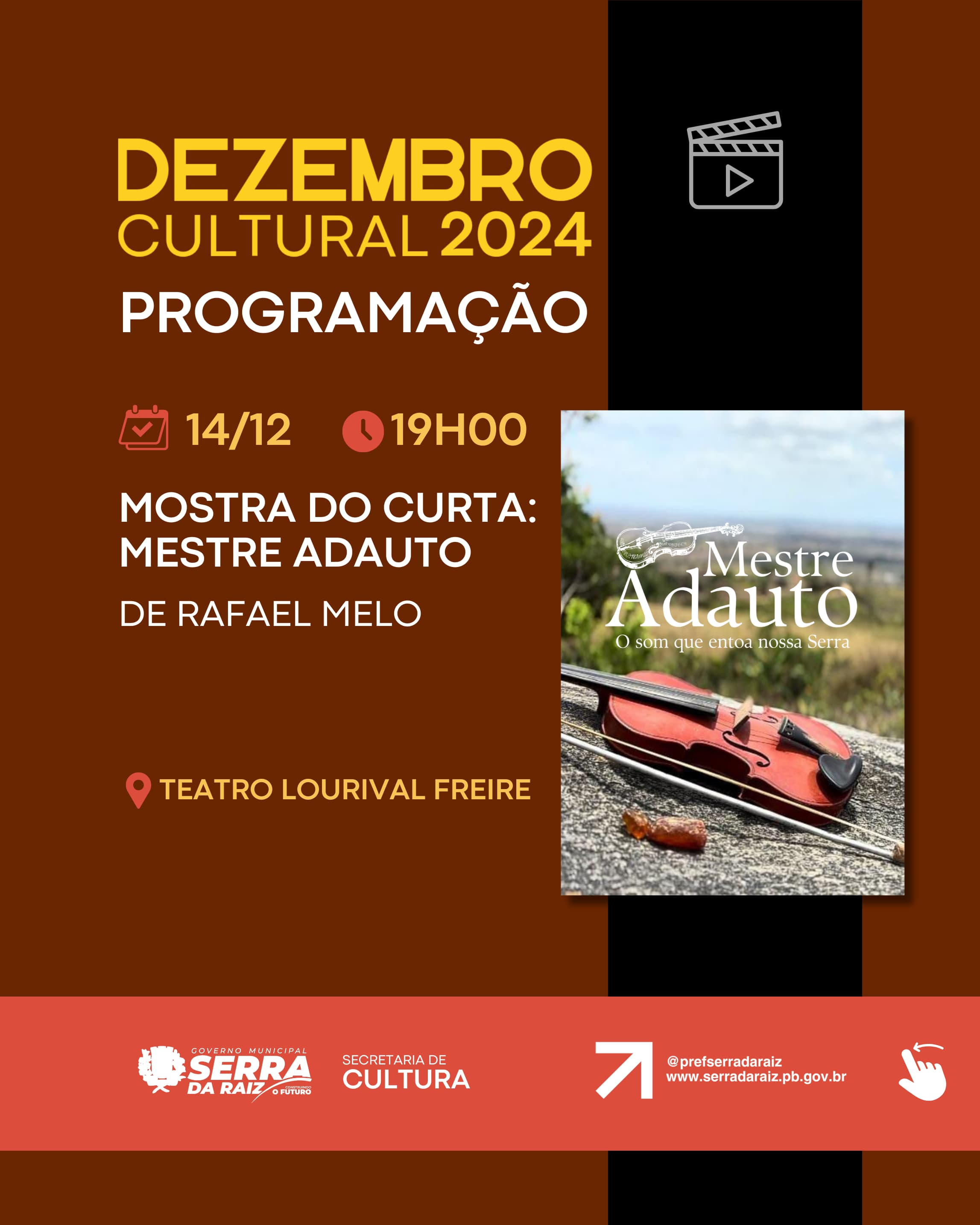 Às 19h, no Teatro Lourival Freire, teremos a exibição de dois curtas metragens: Mestre Adauto - o som que entoa nossa Serra de Rafael Melo e Cajé de Fernando Abreu.