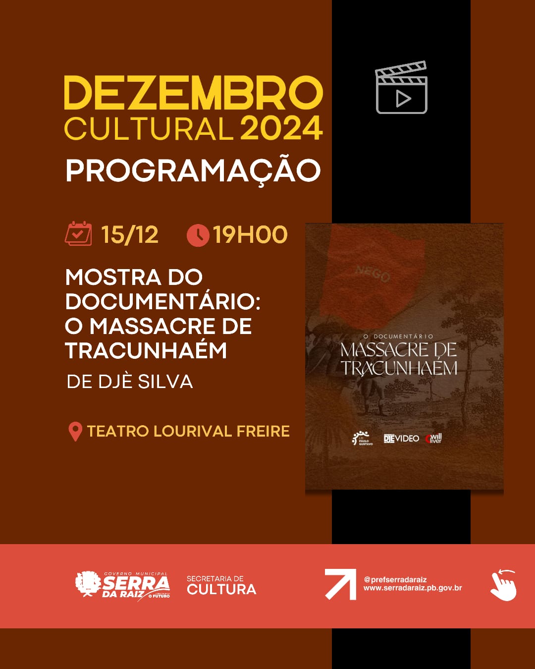 Às 19h, no Teatro Lourival Freire, teremos a exibição de mais duas produções locais: o documentário: O Massacre de Tracunhaém de Djè Silva e a vídeo biografia: A verdade de Adauto de Will Oliver.