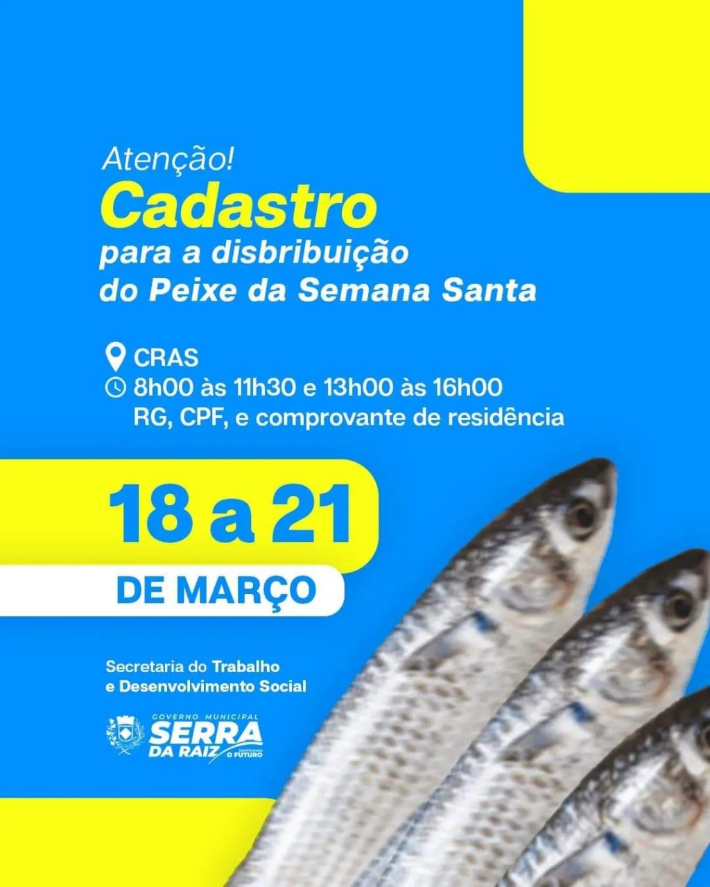 A partir da próxima segunda-feira (18), até a quinta-feira (21) a gestão municipal através da Secretaria do Trabalho e Desenvolvimento Social estará realizando o cadastro para distribuição do peixe na semana Santa.