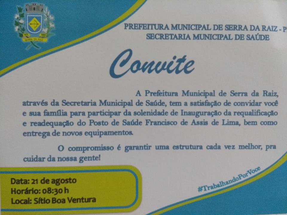 A gestão municipal através da secretaria de saúde estará realizando na próxima terça-feira (21) a inauguração da reforma do Posto de Saúde Francisco de Assis Lima no Sitio Boa Ventura.