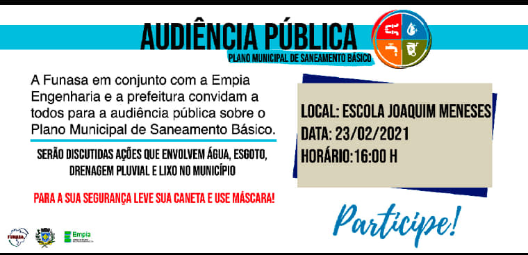 Nesta terça-feira (23) estará acontecendo as primeiras audiências do Plano Municipal de Saneamento Básico, é de suma importância a participação da comunidade nesta etapa final.