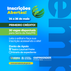 O Governo da Paraíba, através do PROGRAMA EMPREENDER PARAÍBA, vai abrir, na próxima quarta-feira (24/05/23), a partir das 8h, inscrições para municípios da 2ª região, incluindo Serra da Raíz para quem vai pegar crédito pela primeira vez.