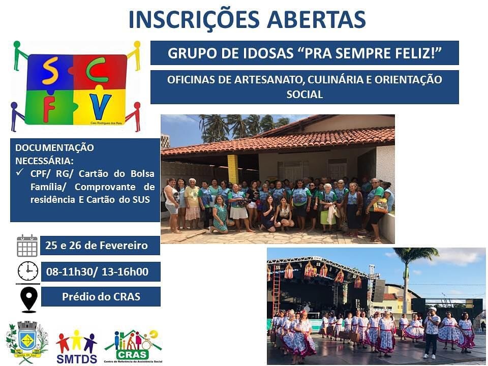 A gestão Municipal através da Secretaria do Trabalho e Desenvolvimento Social estará abrindo na segunda-feira (25) até a terça-feira (26) as inscrições para o Grupo de Idosas Pra sempre Feliz e para o Grupo de Mulheres.
