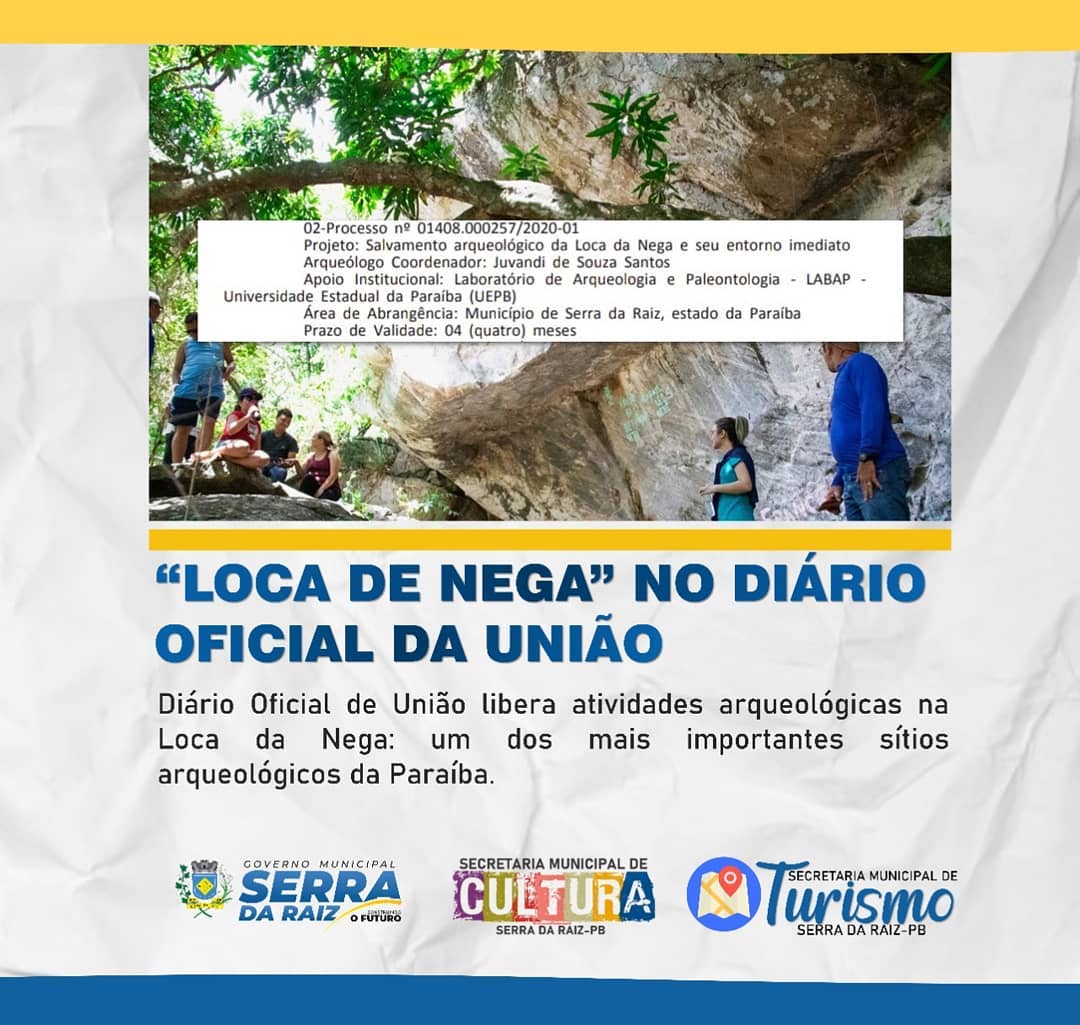 Através do convênio firmado entre a Prefeitura Municipal de Serra da Raiz e a UEPB no ano de 2018, para catalogação e preservação do patrimônio arqueológico e histórico do nosso Município, tivemos hoje a publicação no Diário Oficial da União da liberação das atividades arqueológicas na Loca da Nega: um dos mais importantes sítios arqueológicos da Paraíba.