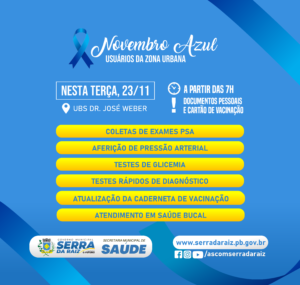 A gestão municipal através da Secretaria de Saúde realiza nestes dias 23 e 24 ações alusivas ao Novembro azul, para cuidados com a prevenção do câncer de próstata