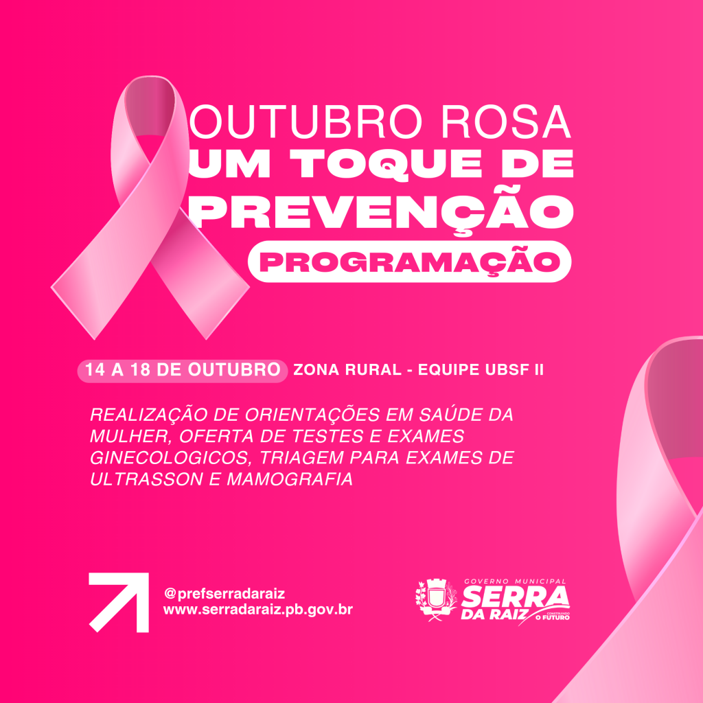 A prefeitura municipal através da secretaria de saúde realizará durante todo o mês uma programação especial alusiva ao Outubro Rosa, mês de prevenção a doenças e cuidado com a saúde da mulher.