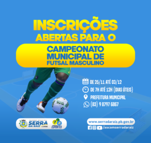 A gestão municipal através da secretaria de esportes abre nesta quinta-feira (25), as inscrições para o campeonato municipal de futsal na categoria adulto.