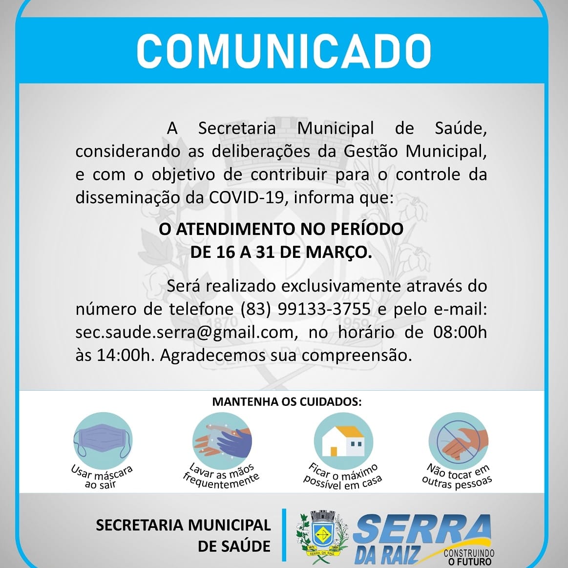 Todas as secretarias municipais alteraram seus atendimentos para atender o decreto municipal que visa garantir a prevenção contra o avanço da covid-19 no município.