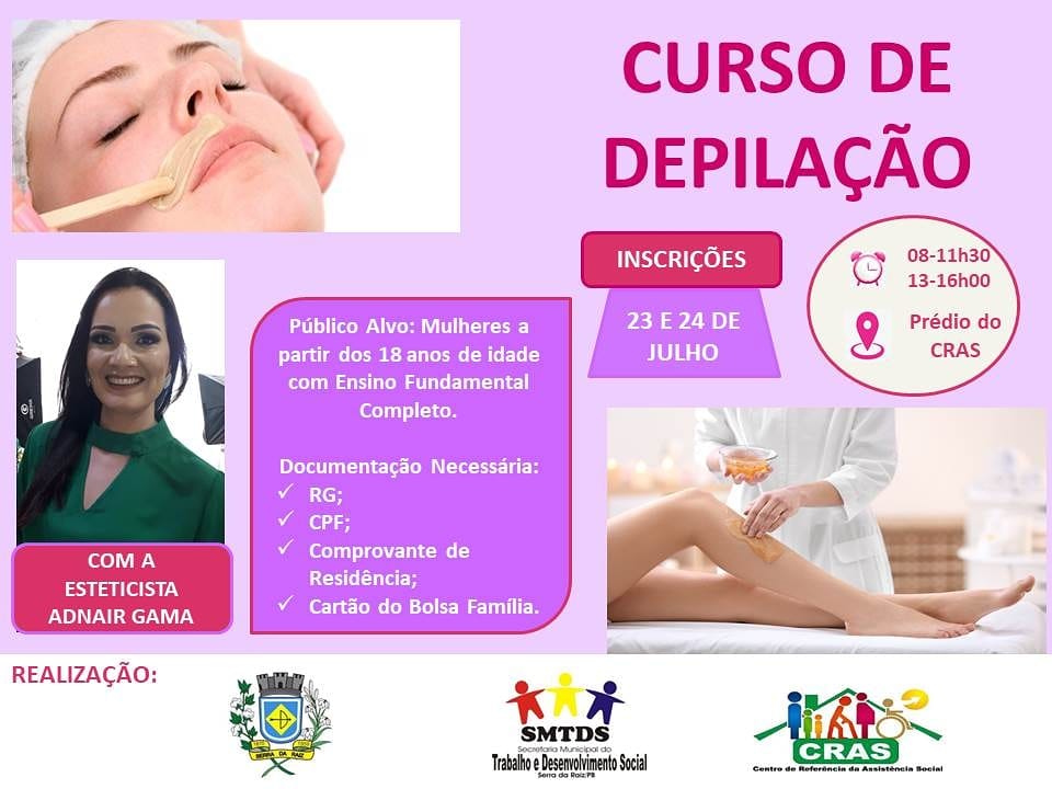 A Prefeitura Municipal de Serra da Raiz através da Secretaria de Trabalho e Desenvolvimento Social abre inscrições para o Curso de Depilação, o curso terá carga horária de 80 horas divididas em atividades semanais.