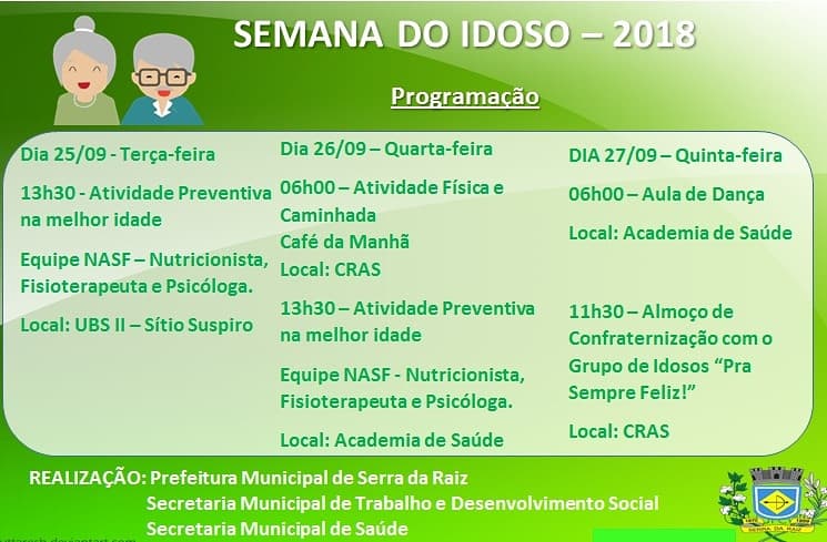 A gestão municipal através da secretaria do trabalho e desenvolvimento social, realiza nos dias 25, 26 e 27 uma programação especial em comemoração ao dia do Idoso.