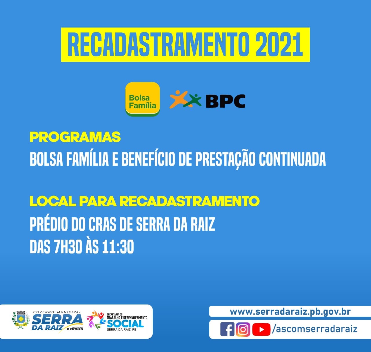 A secretaria do trabalho e desenvolvimento social está realizando o recadastramento dos programas Bolsa Família e do Benficio de Prestação Continuada (BPC).
