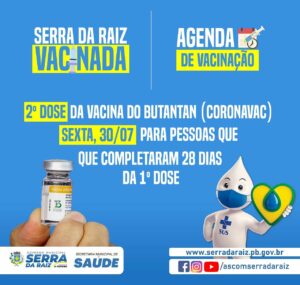 E nesta Sexta-feira 30/07 , iremos realizar 2° DOSE da Vacina BUTANTAN para as Pessoas que já completaram 28 dias da 1° DOSE.