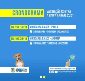 A gestão municipal através da Secretaria de Saúde informa que a campanha de vacinação contra a raiva animal teve início.