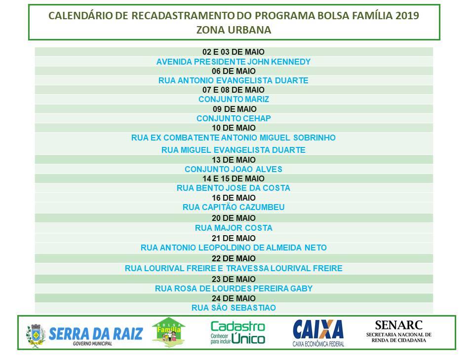 A Gestão Municipal do Programa Bolsa Família no município divulgou o calendário de recadastramento 2019.