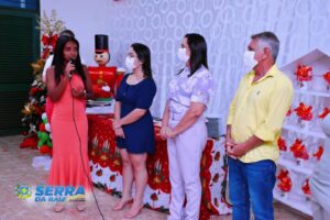 O prefeito Luiz Machado ao lado da primeira dama Josiene Córdula e da secretária de Desenvolvimento Social, Kallyne Fernandes, esteve participando da confraternização de final de ano do grupo de Mulheres.