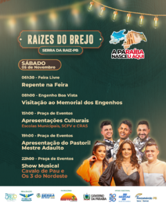 A programação da Rota Cultural Raízes do Brejo chega a Serra da Raíz neste final de semana, o evento acontece nos dias 4, 5 e 6 de novembro.